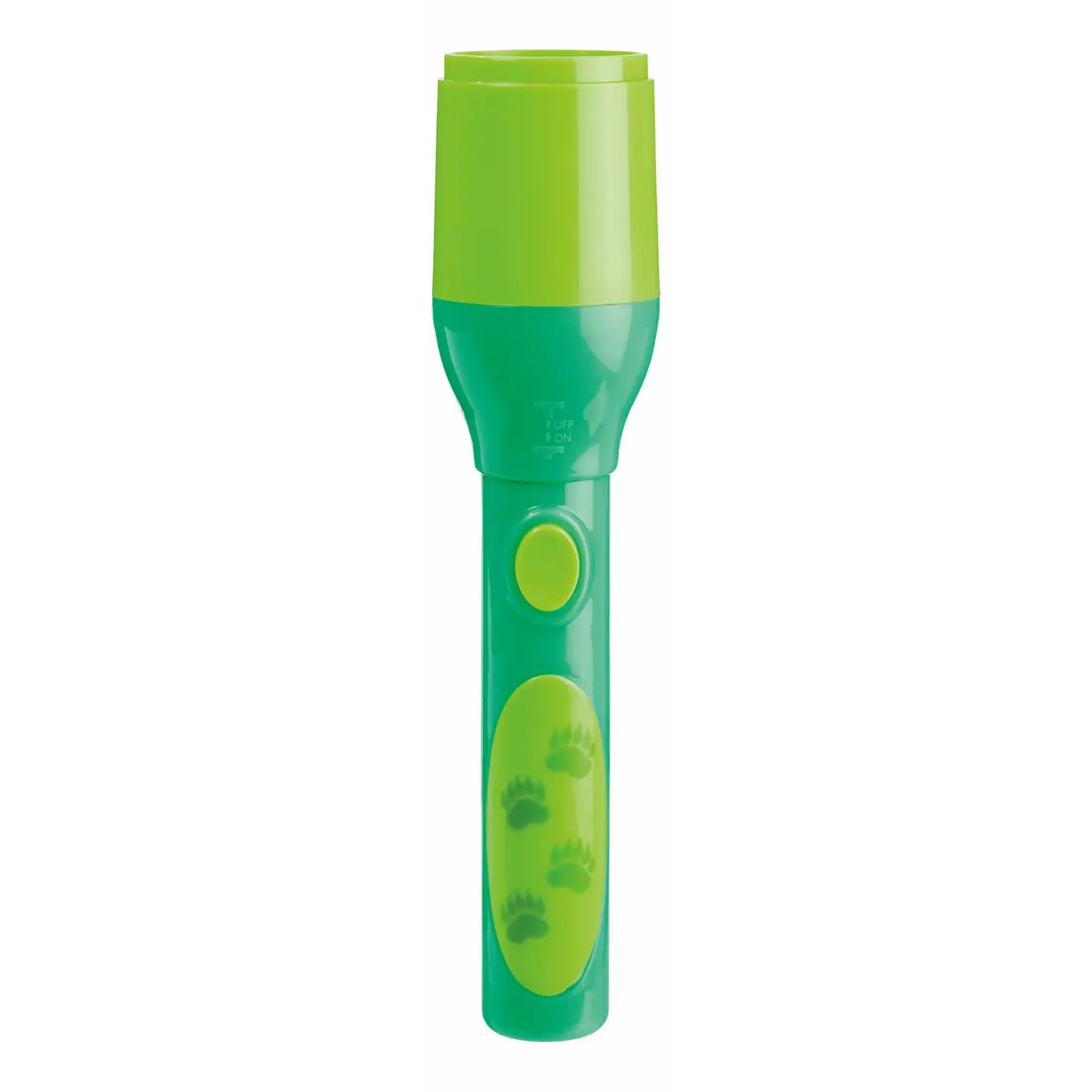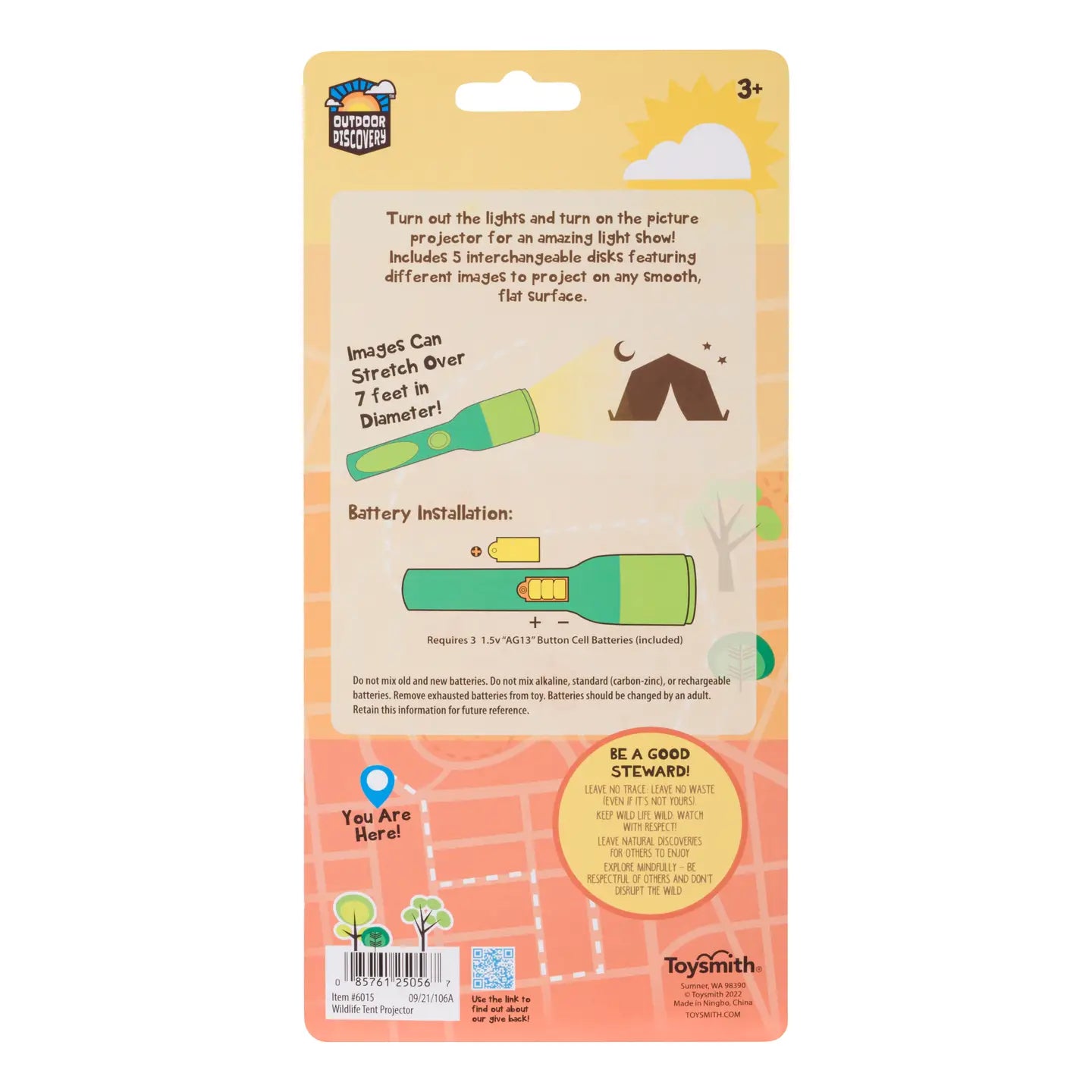 The Wildlife Tent Projector from Outdoor Discovery is a 6.25-inch-long handheld button-activated flashlight that comes with 5 detailed image slide covers. Slide cover illustrations include a walking bear, a canoe, a trio of pine trees, a tent, and a marshmallow roasting over a campfire. Comes neatly packaged in an outdoor-themed peggable blister packet. • Age: 3+