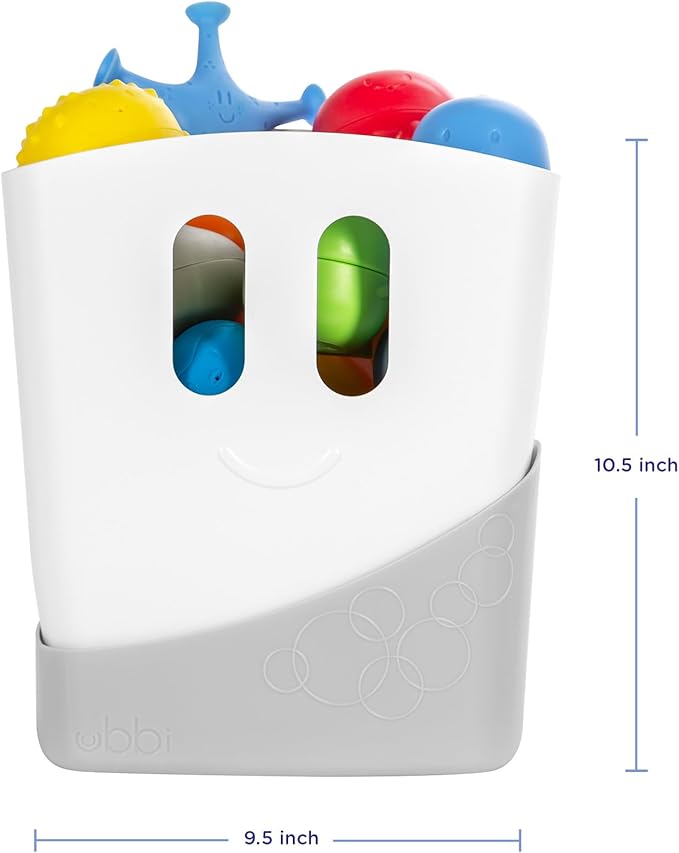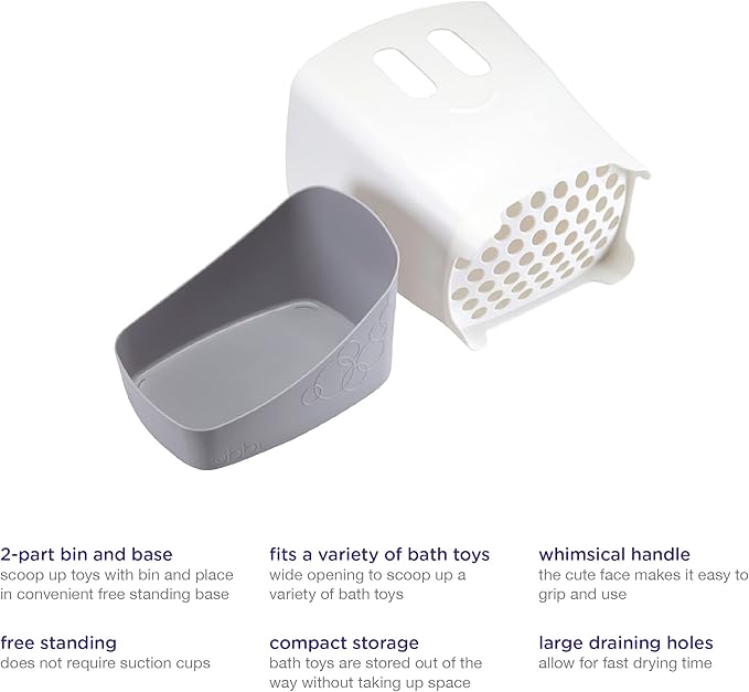 Organize bath time and keep it fun with Ubbi's Gray Bath Toy Drying Bin. This caddy features a 2-part bin and base, complete with large drainage holes for quick and tidy drying and storage of bath toys. Easily scoop up toys with the built-in handle and place in the water-catching base until the next bath. With its wide opening, the freestanding design can hold a variety of shapes and sizes. Plus, it makes for a great baby shower gift in a variety of trendy colors!