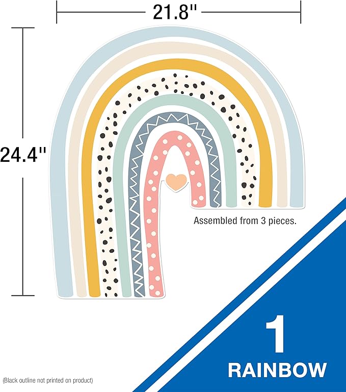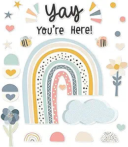 Create a cheerful classroom with this 76-piece "We Belong" set! Features a "Yay you're here!" banner, boho rainbow, clouds, bees, stars, hearts, flowers, polka dots, and decorative lines. Made from durable materials perfect for bulletin boards, whiteboards, or any display. Instantly transform your space into a welcoming environment students will love!